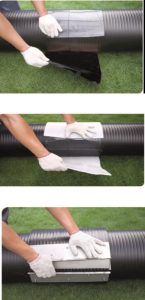 Bước 2: Dùng tấm đai HDPE hay còn gọi là đai ốp nhiệt, màng keo HDPE quấn xung quanh mối nối, tiếp đó dùng đèn khò để gia nhiệt đều trên tấm đai HDPE, tấm đai HDPE sau khi gia nhiệt sẽ co lại ôm chặt mối nối, đảm bảo mối nối kín khít, không bị hở và nước không bị rò rỉ.