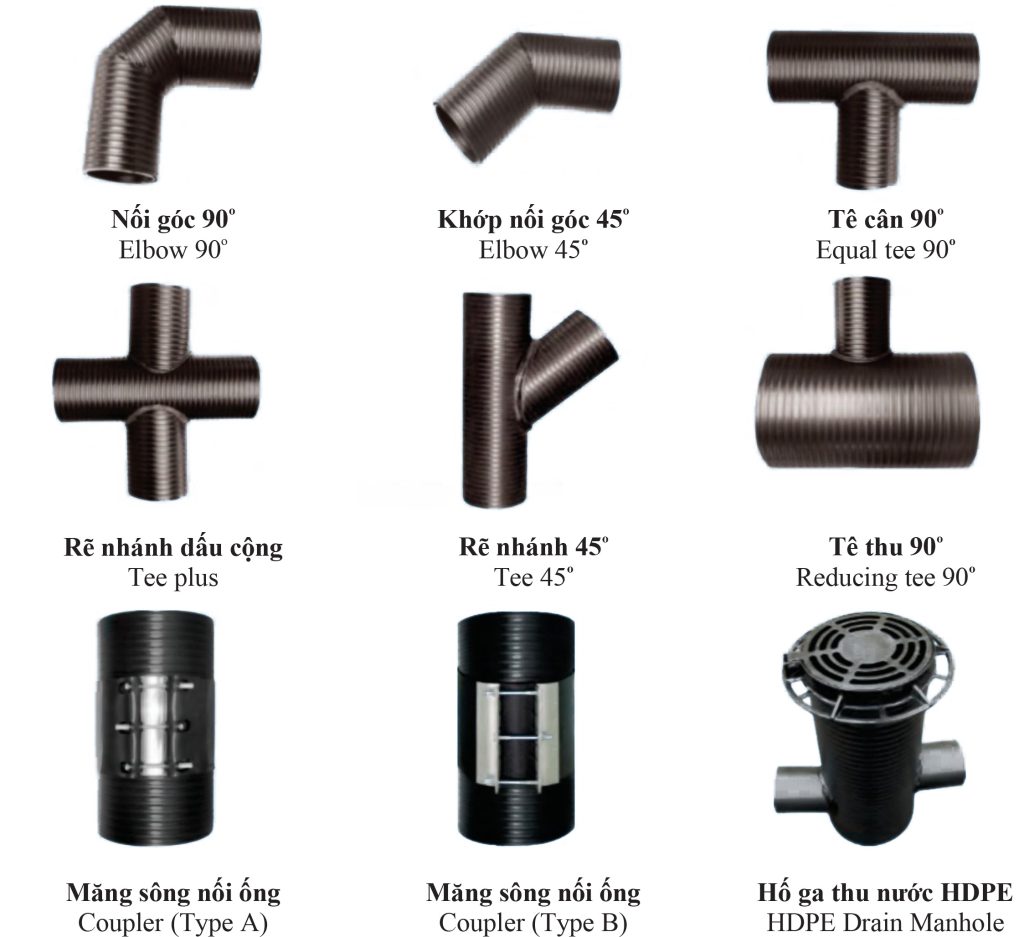 Phụ kiện nối ống gân xoắn HDPE 2 vách gồm có: Cút góc 90 độ, Cút góc 45 độ (Chếch 45 độ), Tê đều (Ba chạc 90 độ), Chữ thập, Chữ Y (Ba chạc 45 độ), Tê thu (Ba chạc 90 độ chuyển bậc), Khâu nối nhựa HDPE, Khâu nối inox, Hố ga thu HDPE….