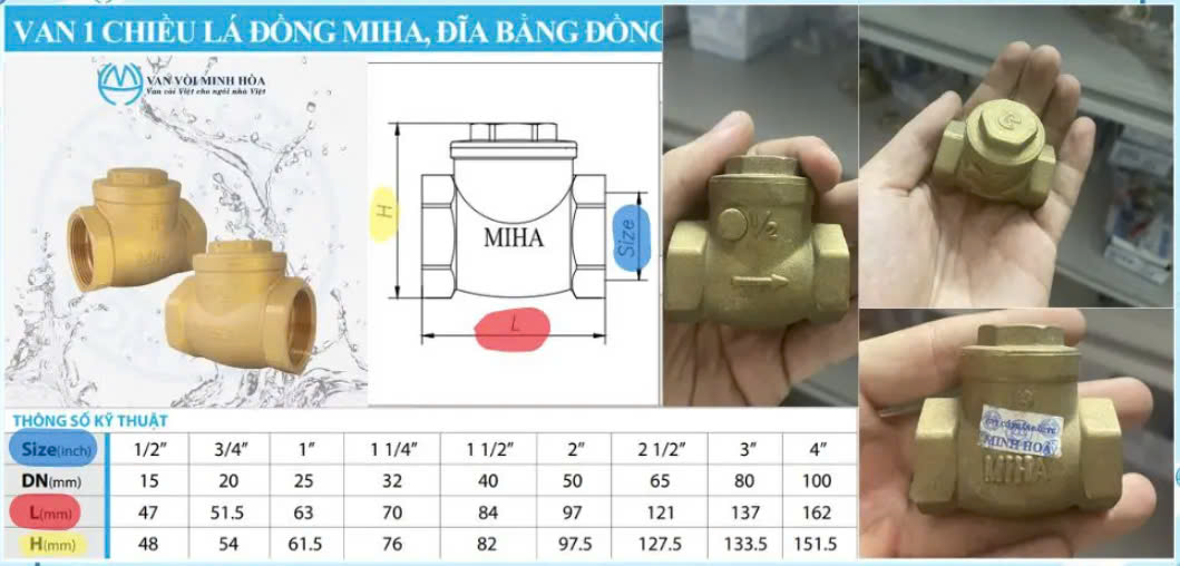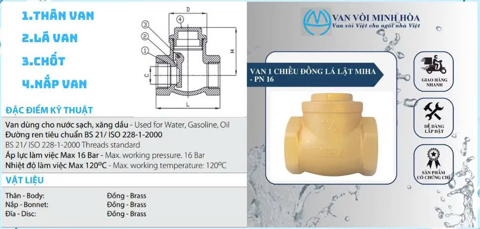 Van 1 chiều lá đồng Miha thuộc chủng van đồng Minh Hòa, bởi van có các bộ phận đều được làm từ vật liệu là đồng thau (Brass) chắc chắn. Chi tiết như sau: