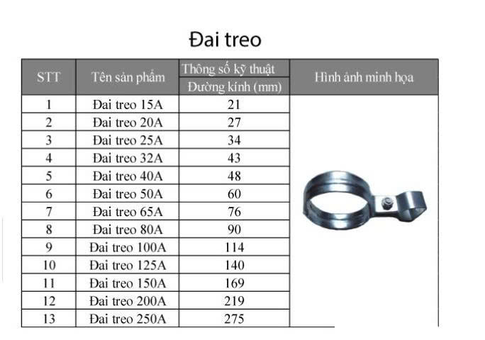 Đai treo ống được thiết kế với một đầu gắn bu lông để cố định với vật bám giữ giúp đường ống an toàn. Đai treo ống thường có kích thước tiêu chuẩn của đường kính từ 15A – 400A